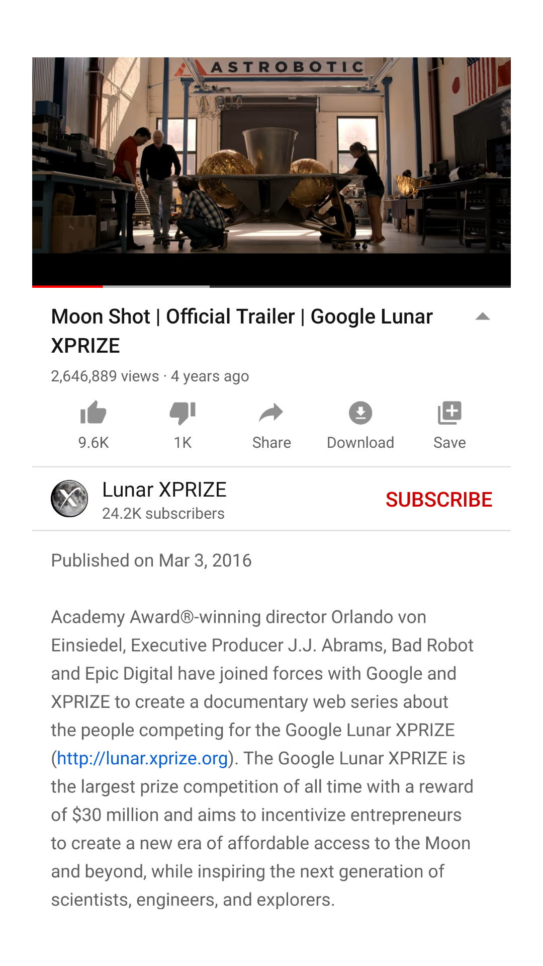 For a video of the Google Lunar XPRIZE watch Moonshot, an online 9 part video series following the teams. See below the Google Lunar XPRIZE Moon Shot Trailer from Academy Award winning director Orlando von Einsiedel & Grain Media, Executive Producer J.J. Abrams, Bad Robot and Epic Digital.